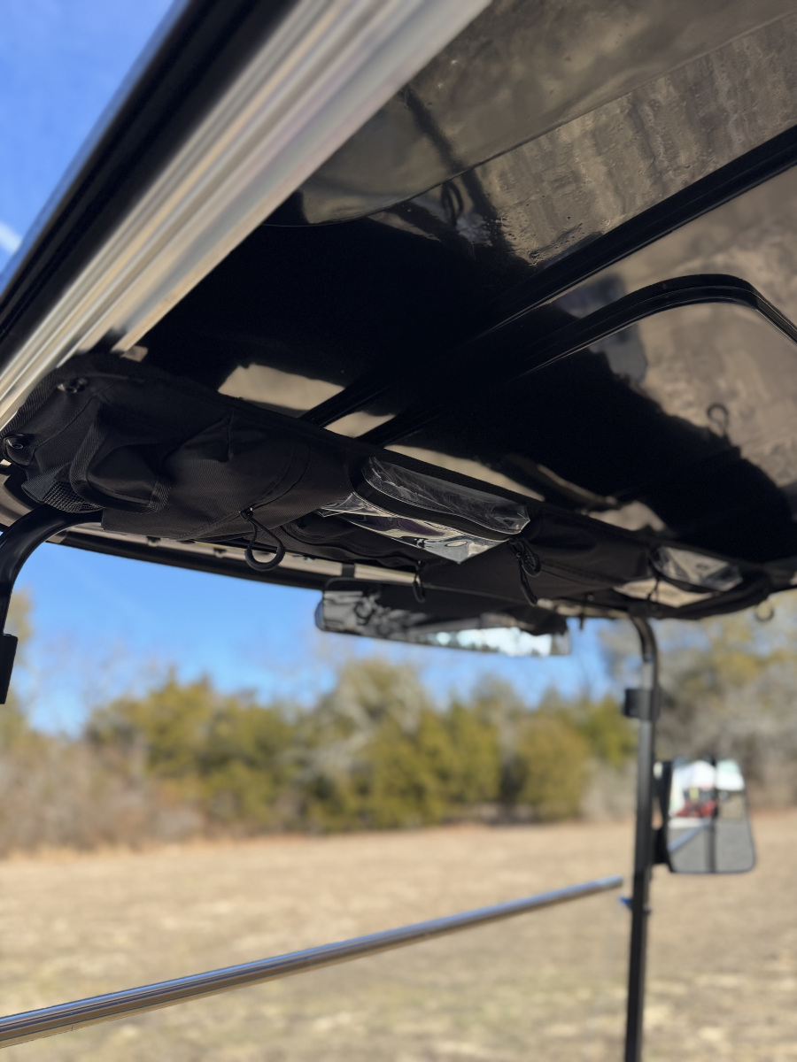 - Overhead zippered gear bag mounted in front of roof for out of the way storage of small items