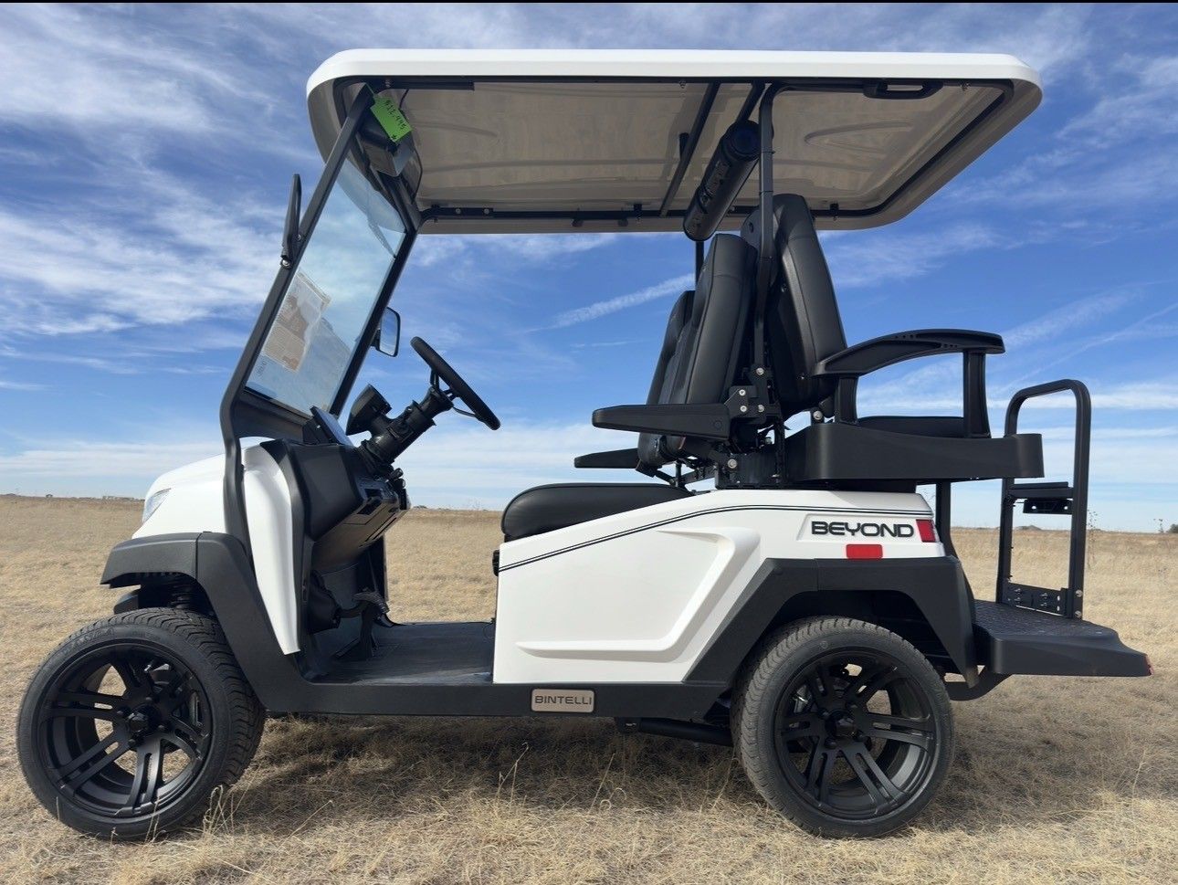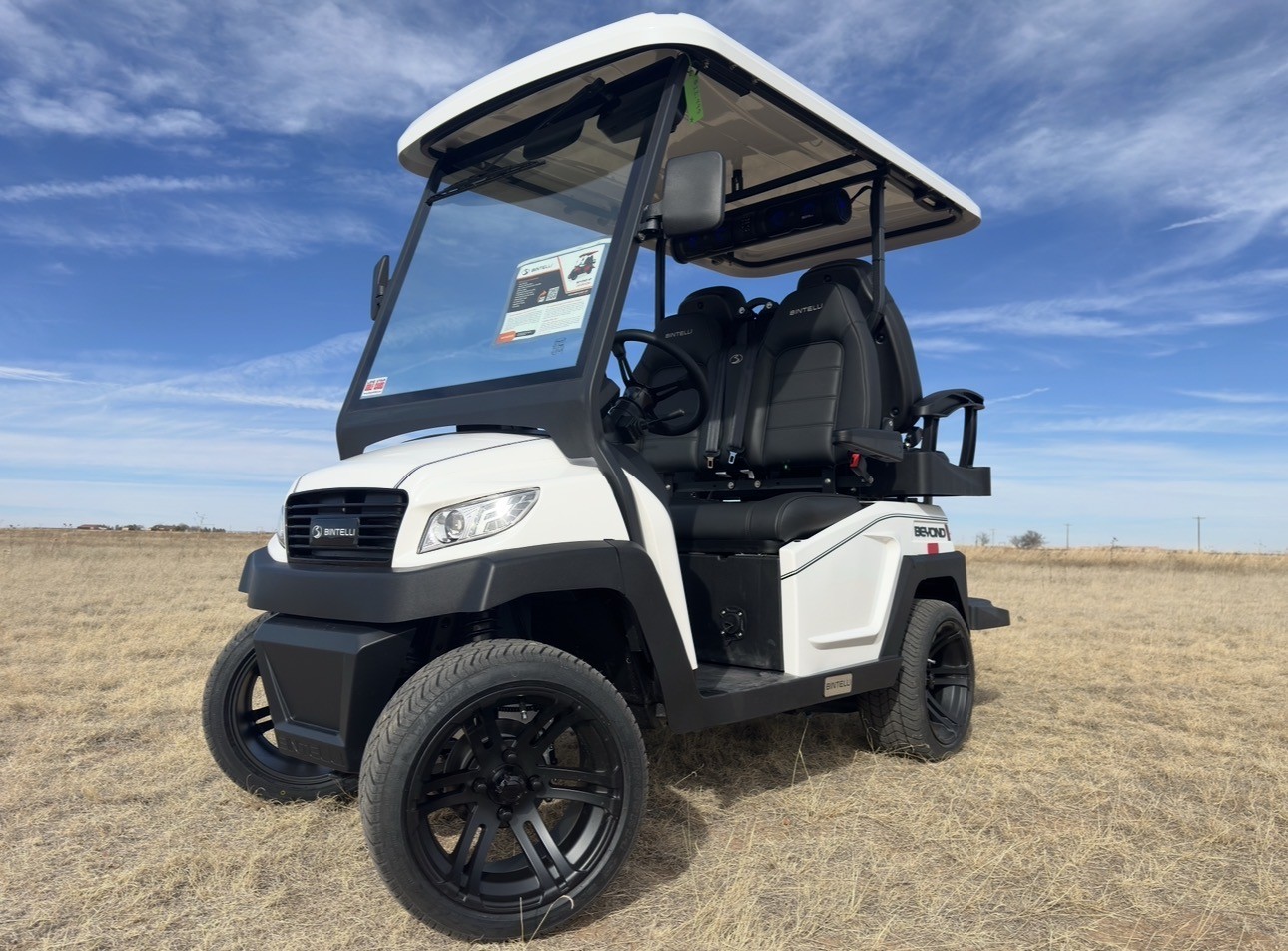 This Bintelli Beyond 4PR street legal golf cart is the newest addition to the Bintelli fleet and it is FULLY loaded! Complete with an aluminum frame, aluminum roof supports, AC motor, LED lighting, 23″ tires, a Bluetooth sound system, reverse camera, hydraulic disc brakes, two-tone premium seats, on-board smart charger, dual USB plugs, extended roof, rear flip seat, head lights, tail lights, turn signals, DOT windshield with wiper, DOT tires, DOT 3-point seat belts, and 105 AH Lithium Battery!